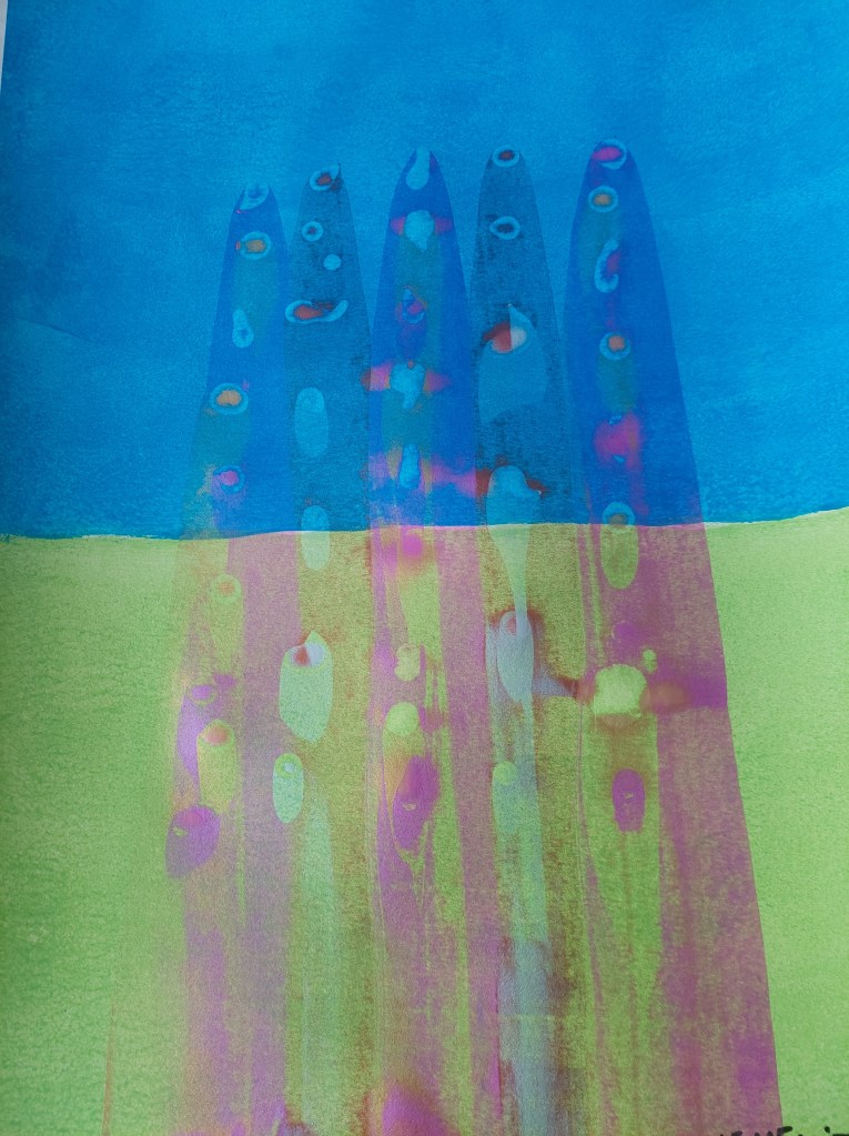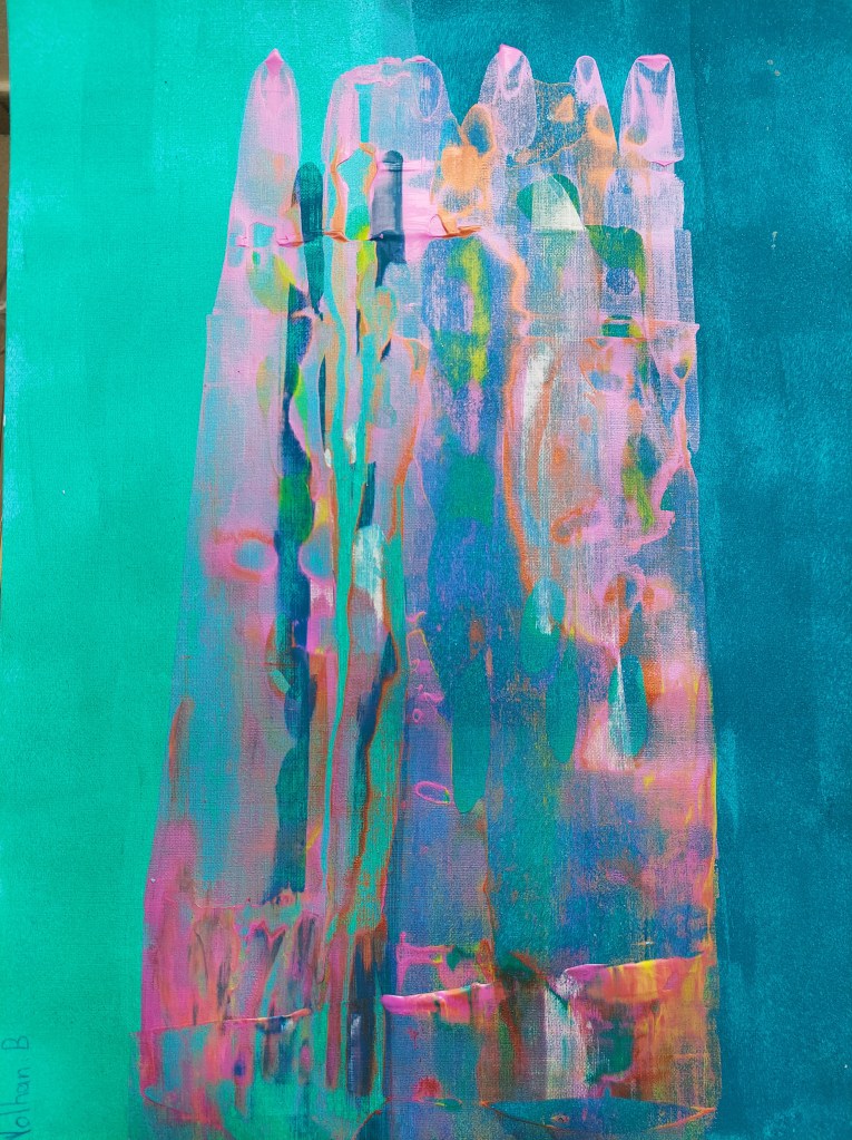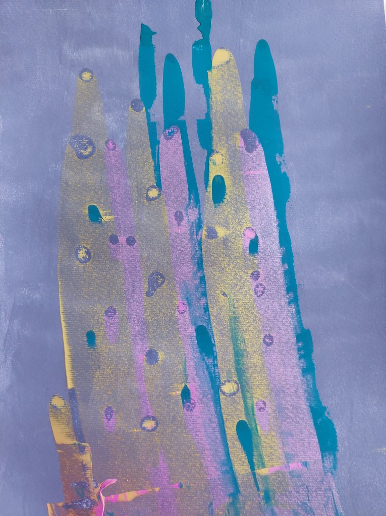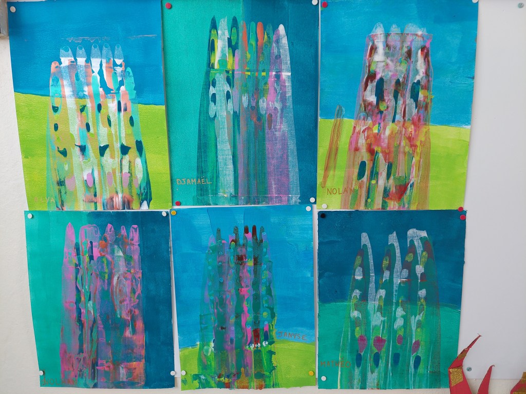Dans le cadre de l’action académique à laquelle nous participons , mes Cm2 ont réalisé avec de la peinture gouache et de l’acrylique des œuvres abstraites sur feuille. On a commencé par des tâches on a fini par des traces…