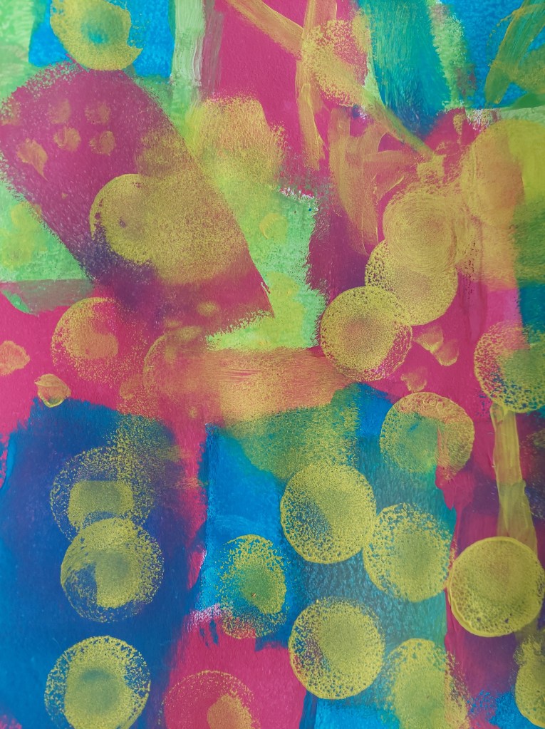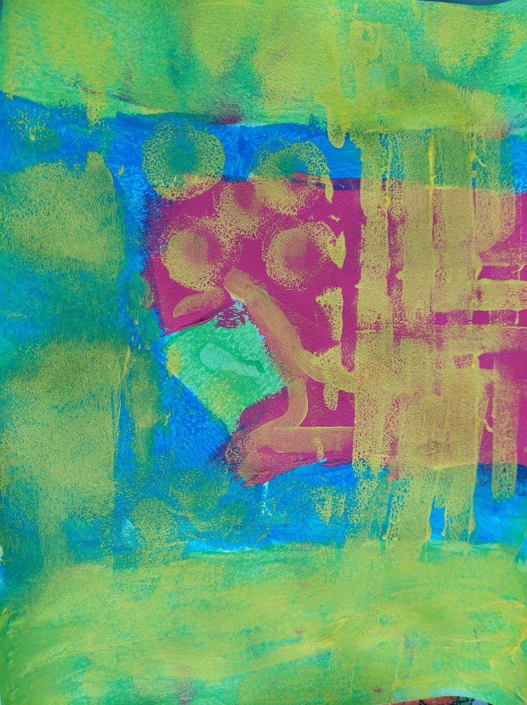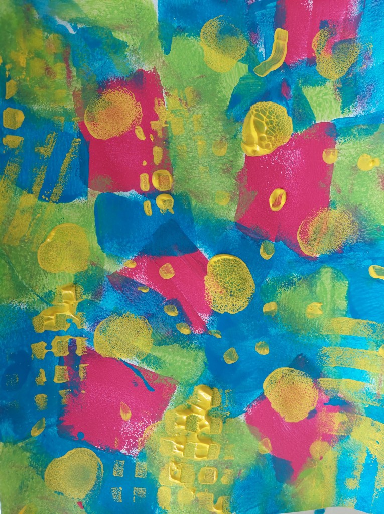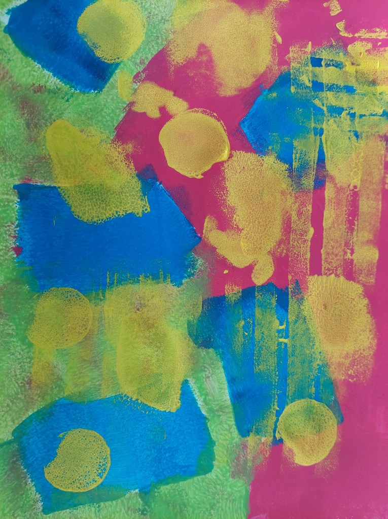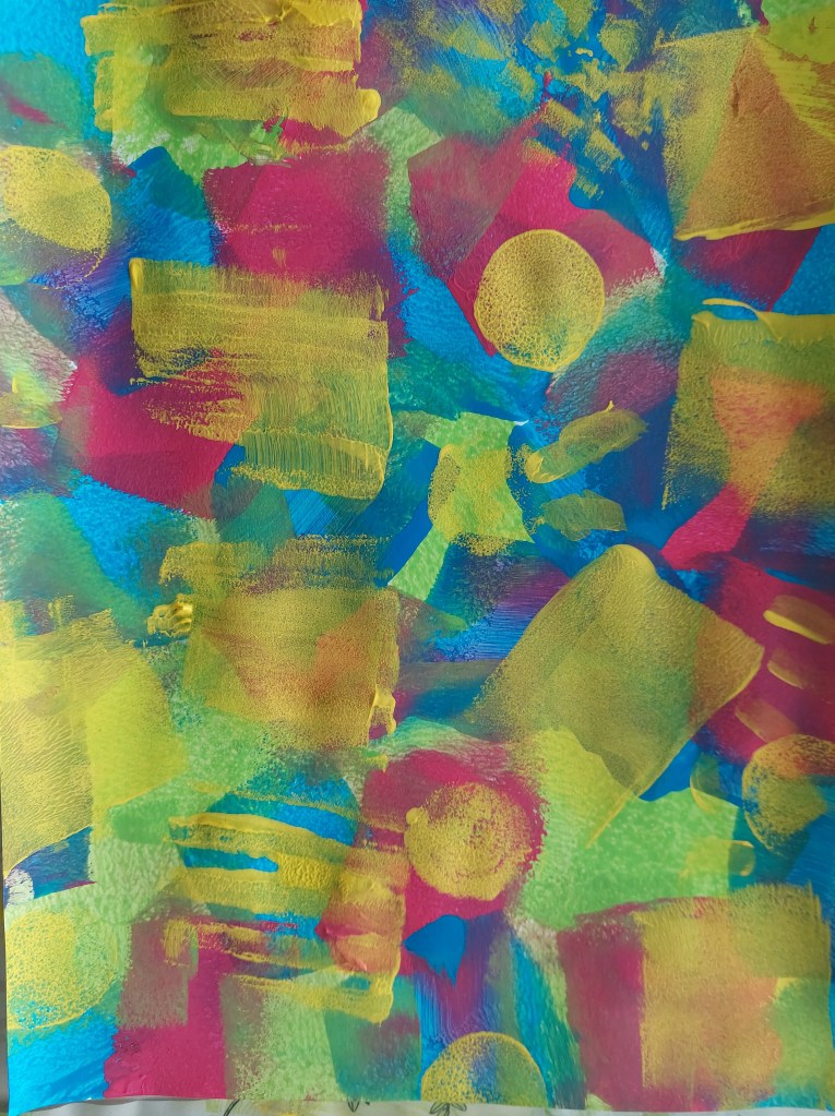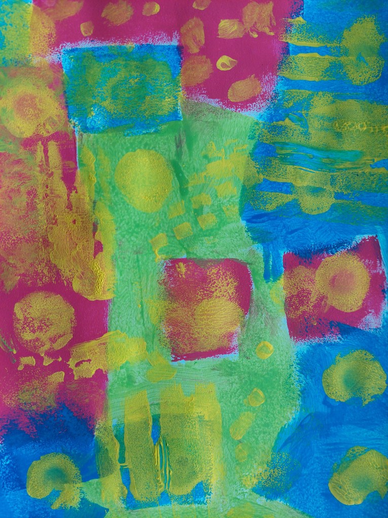 Après avoir fait un fond coloré la semaine d’avant, les CE1 ont fait des traces jaunes sur leurs œuvres. La couleur jaune est venue sublimer le fond : bleu rouge et vert, des compositions plastiques. Ils ont utilisé divers instruments pour obtenir ces effets : les pinceaux fins des rouleaux des pochoirs et des tampons.