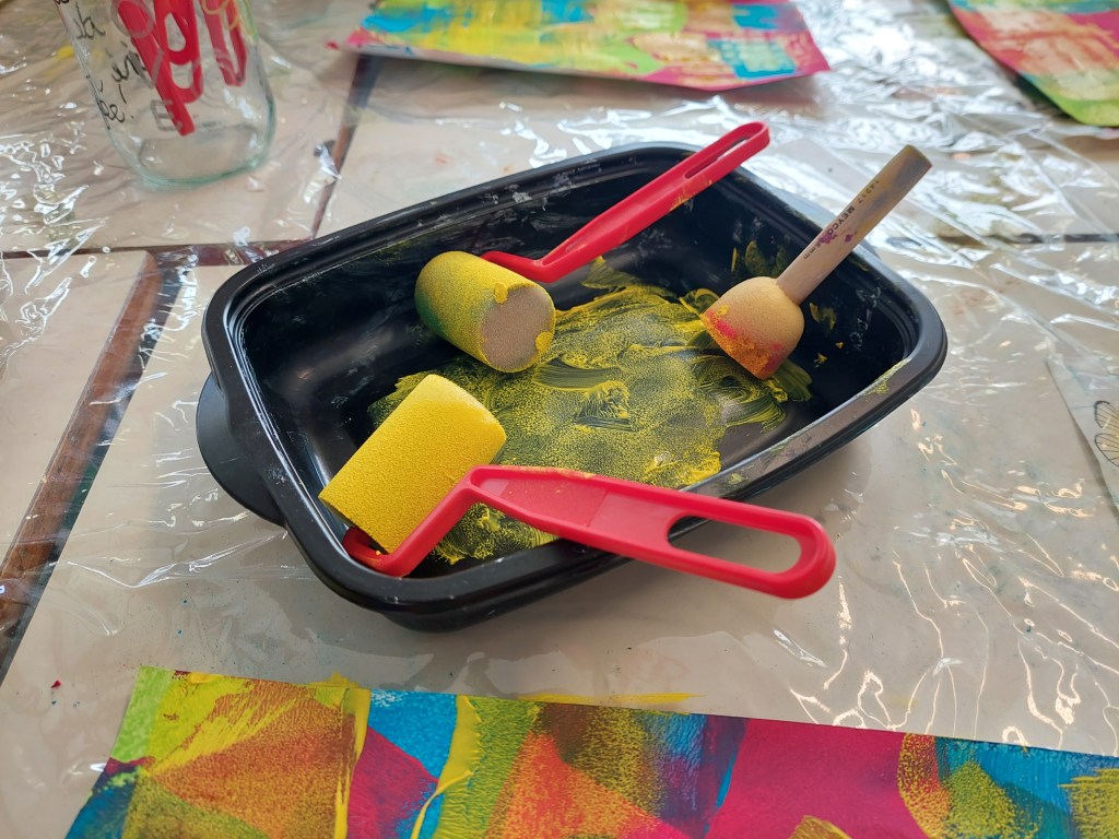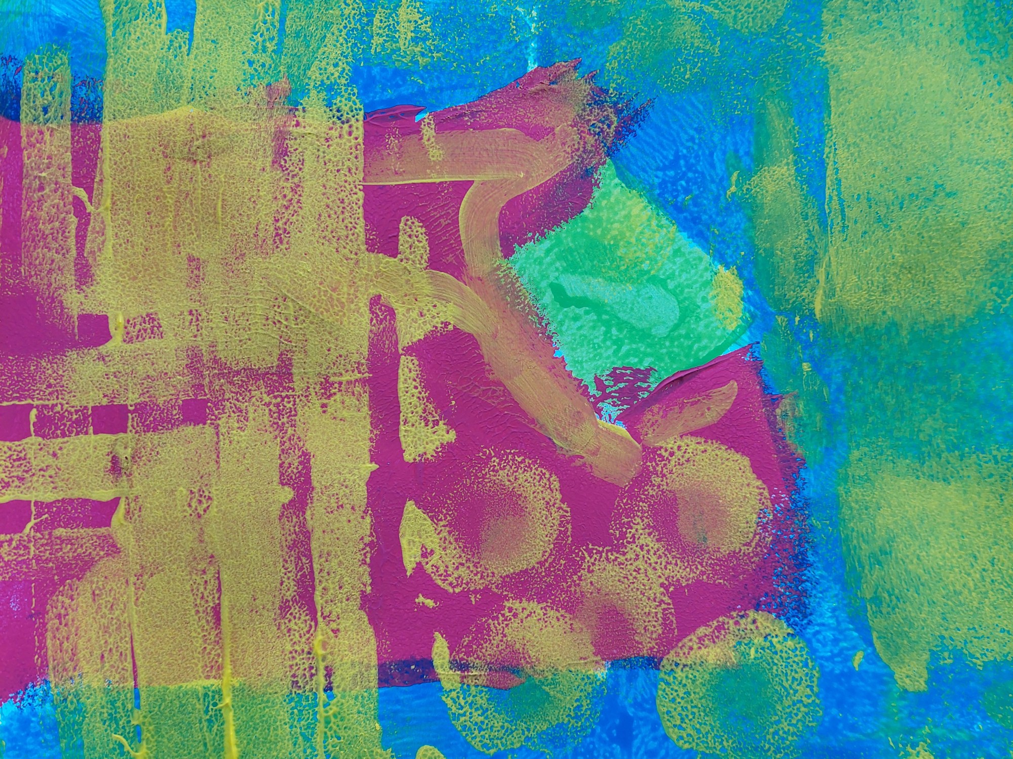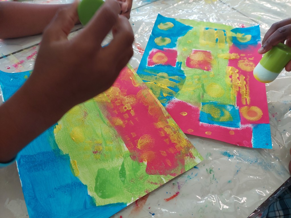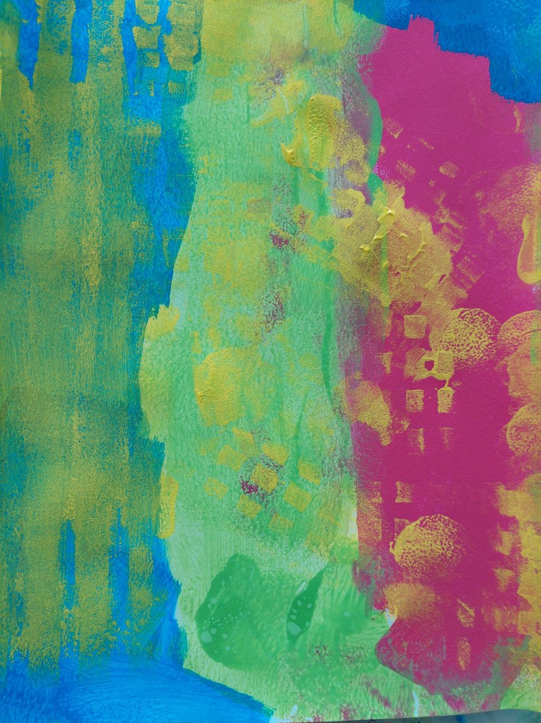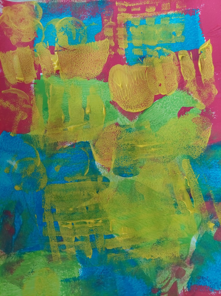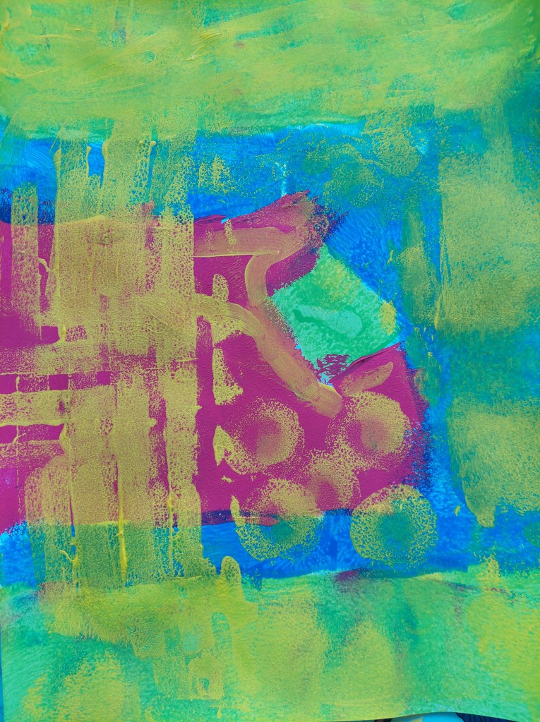 Après avoir fait un fond coloré la semaine d’avant, les CE1 ont fait des traces jaunes sur leurs œuvres. La couleur jaune est venue sublimer le fond : bleu rouge et vert, des compositions plastiques. Ils ont utilisé divers instruments pour obtenir ces effets : les pinceaux fins des rouleaux des pochoirs et des tampons.