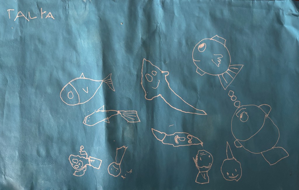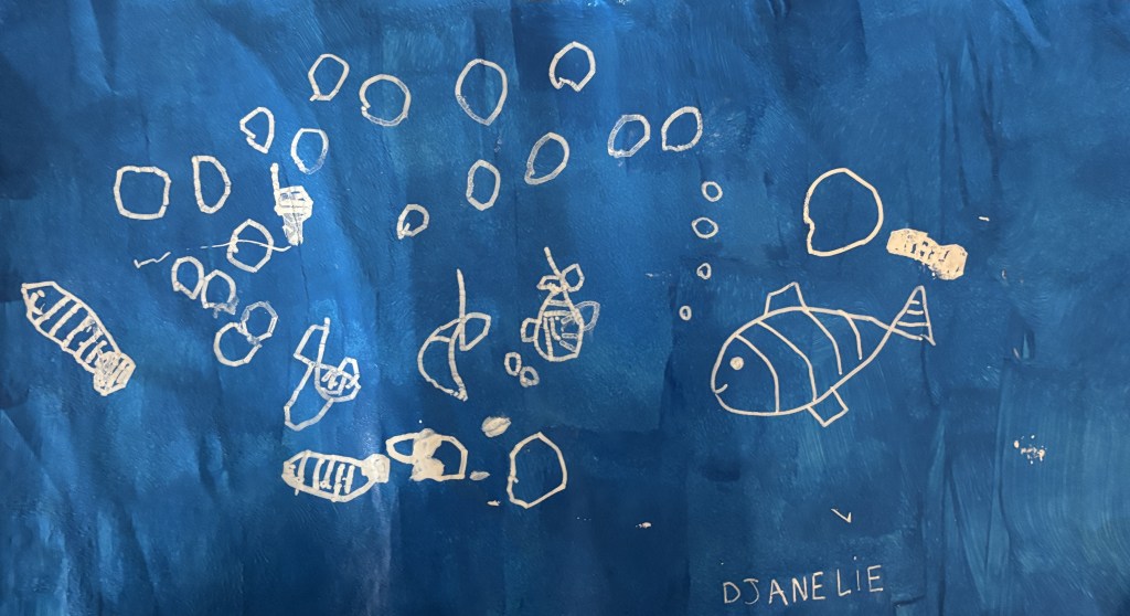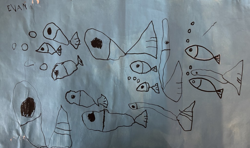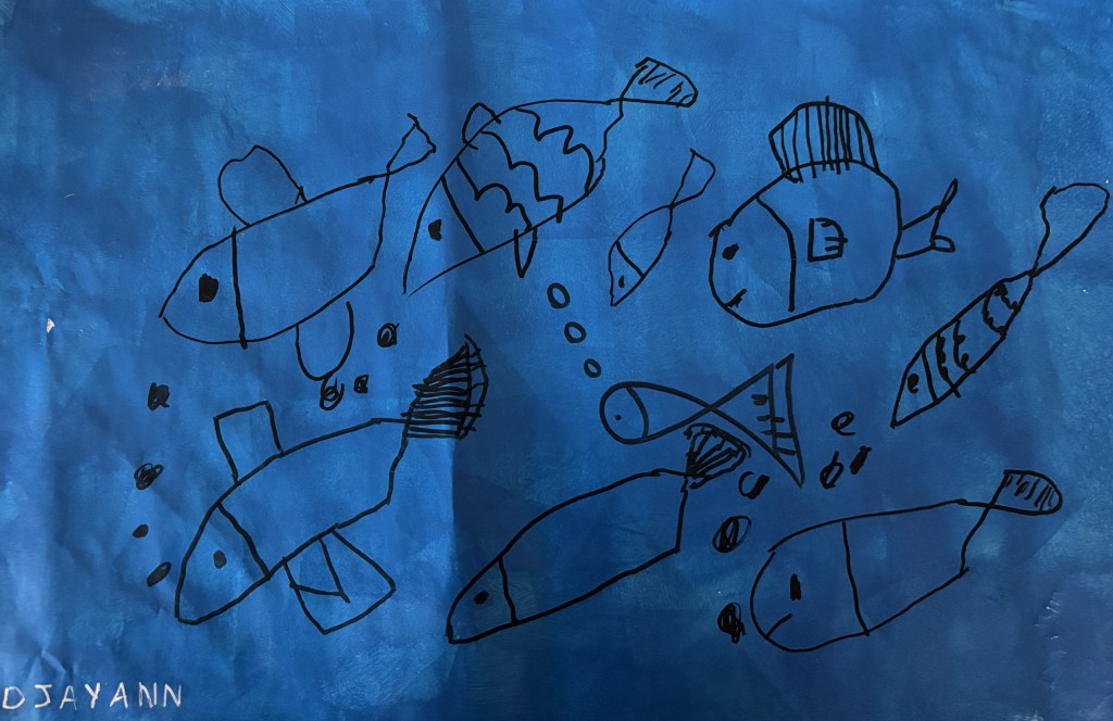 *Deuxième étape ; dessiner les poissons selon un modèle représenté au tableau